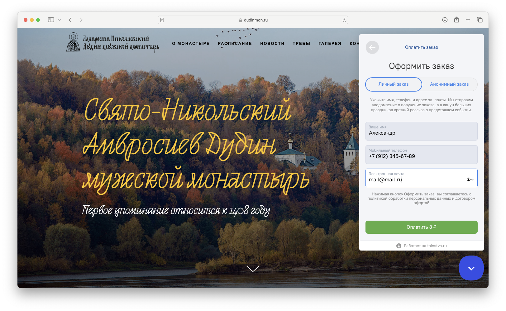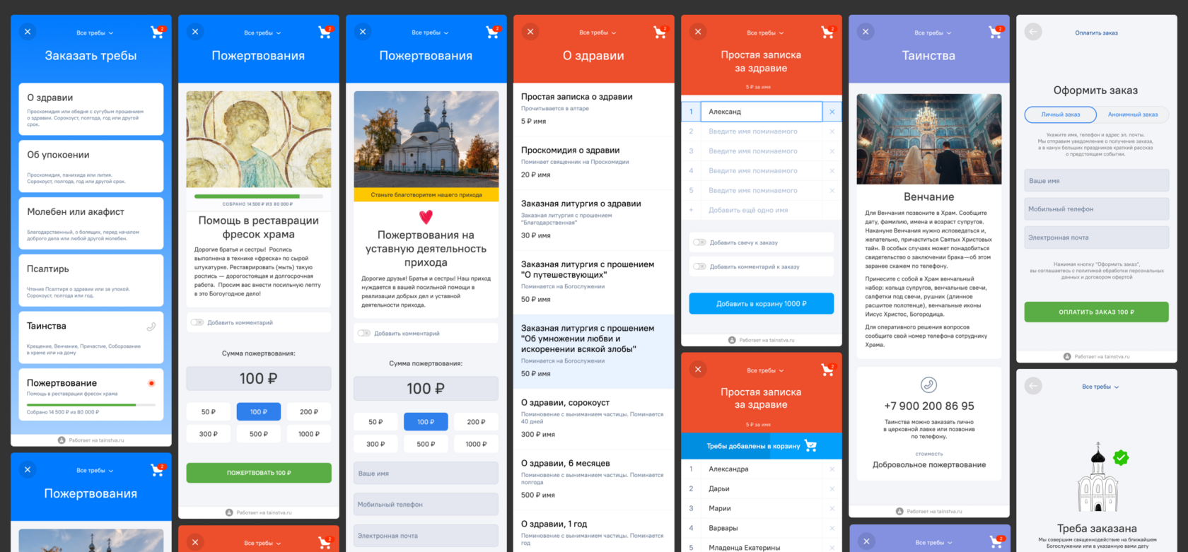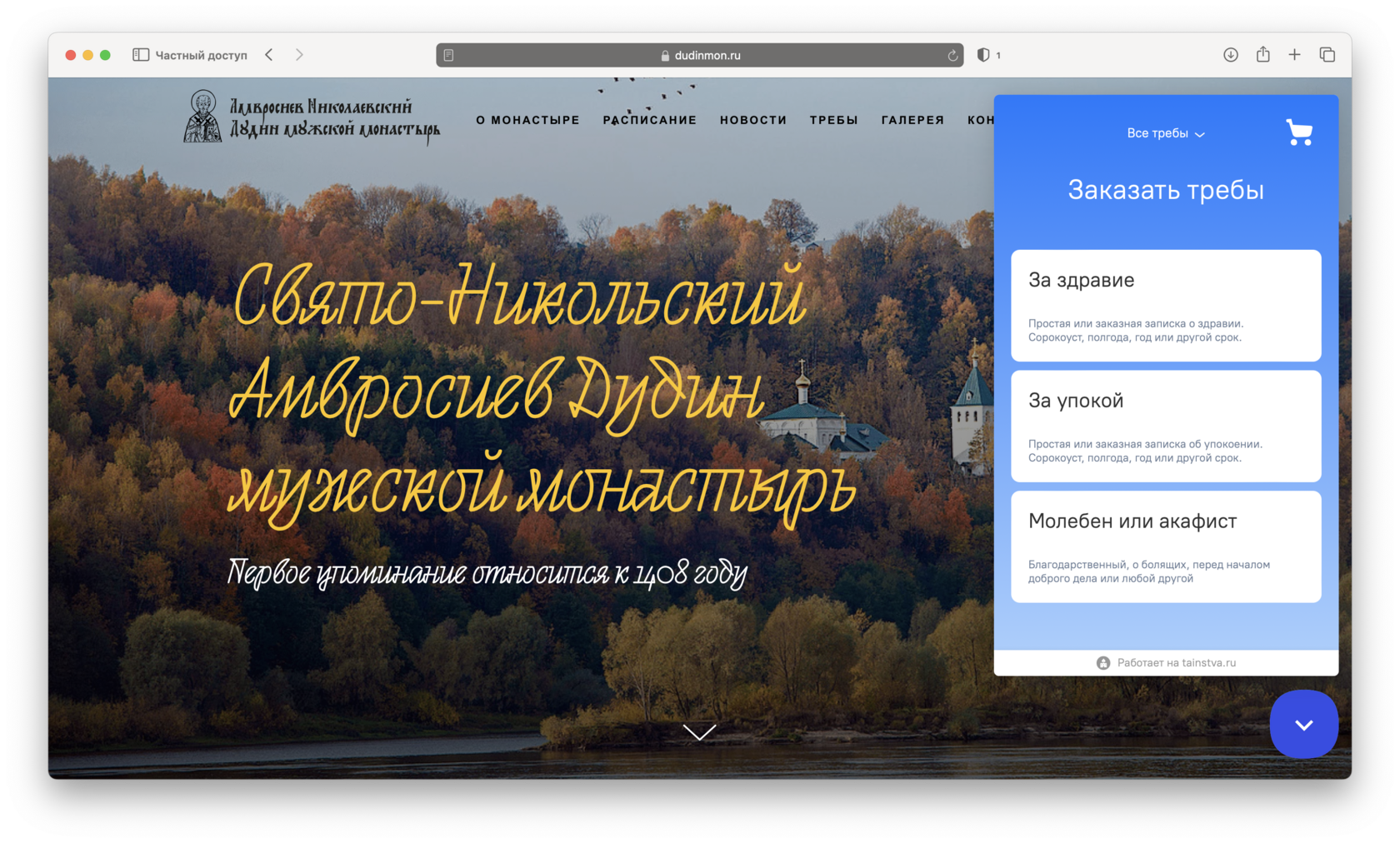 Виджет сервиса tainstva.ru — интерактивный модуль для сбора пожертвований и прием треб онлайн.