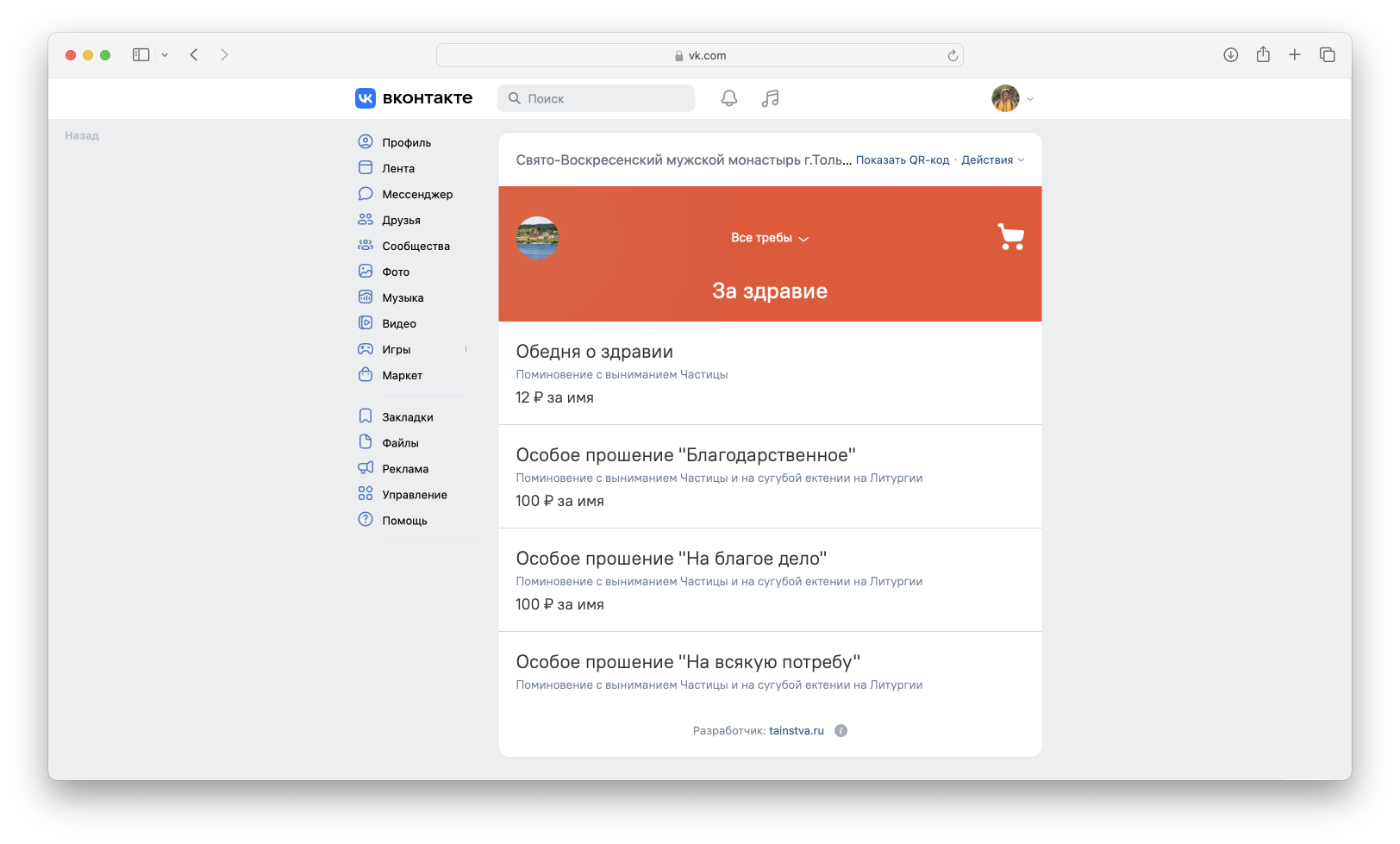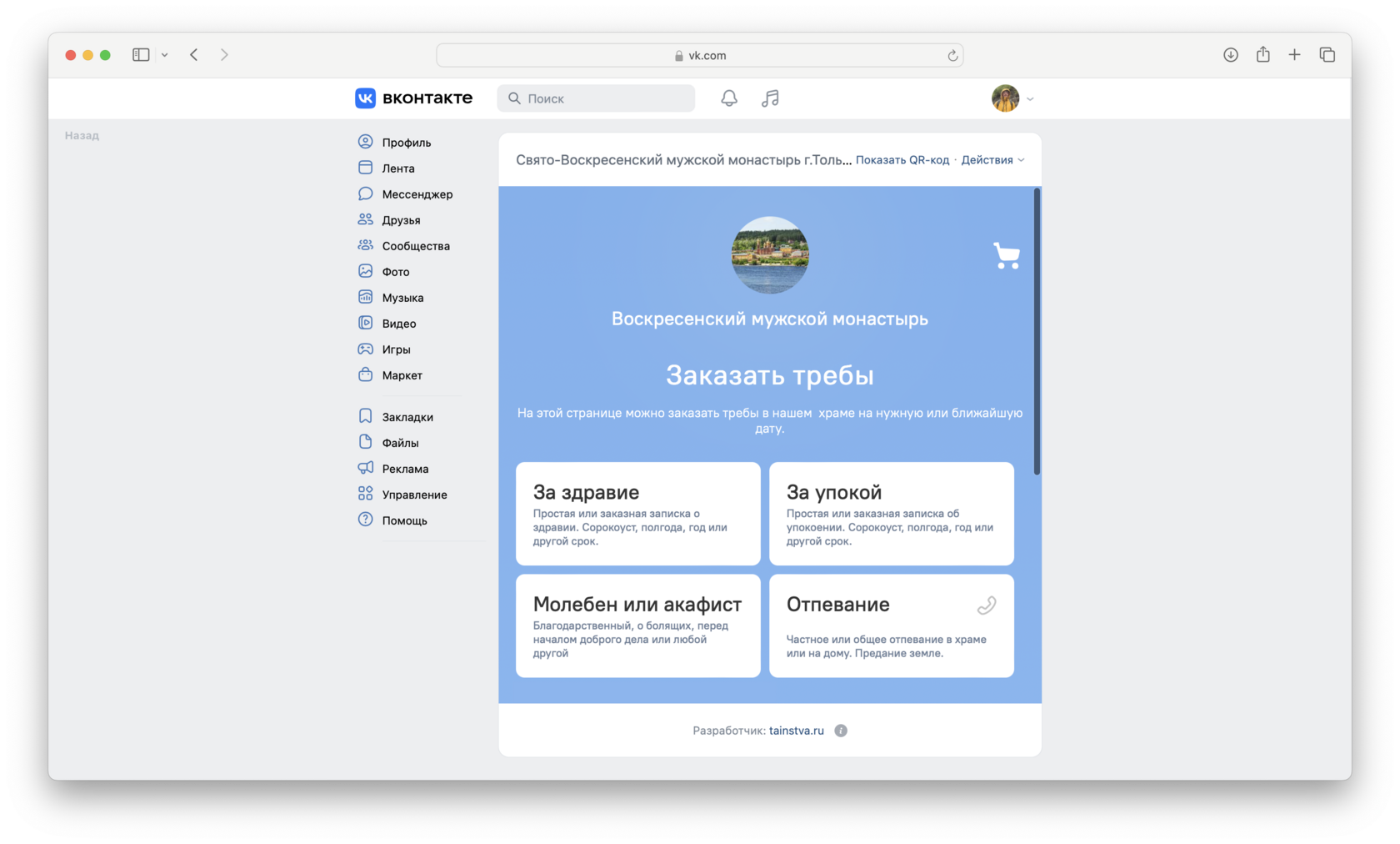 Приложение таинства.ру интегрируется в группу прихода на платформе VK и предоставляет пользователям возможность оформлять заказы на требы онлайн непосредственно в социальной сети. Доступ к приложению имеют только те приходы, которые зарегистрированы на сервисе tainstva.ru. Для установки приложения нужен доступ администратора группы. После установки и настройки любой пользователь ВКонтакте сможет воспользоваться функцией заказа треб через это приложение.